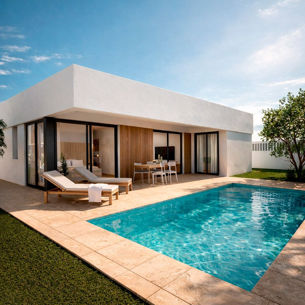 Proyecto completo de arquitectura e ingeniería · Diseño interior · Construcción total de la vivienda · Cocina y armarios incluidos · Gestión de permisos · Solicitud de suministros · Dirección facultativas y legalizaciones