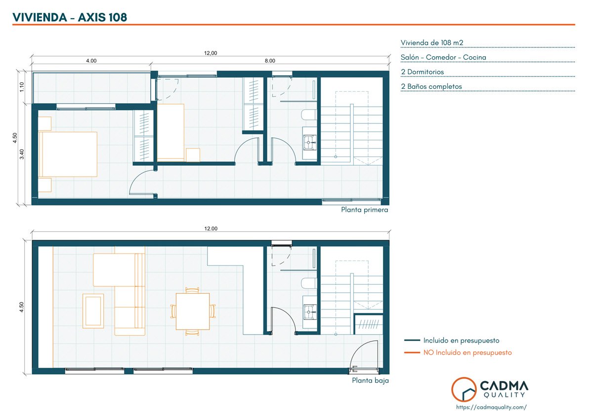 Vivienda personalizada distribuida en dos plantas de 108 m2 de superficie. Planta baja compuesta por un hall de entrada con escaleras de acceso a la planta superior, un baño completo y un concepto open plan con salón-comedor y cocina totalmente equipada Planta alta compuesta por dos dormitorios y otro baño completo.