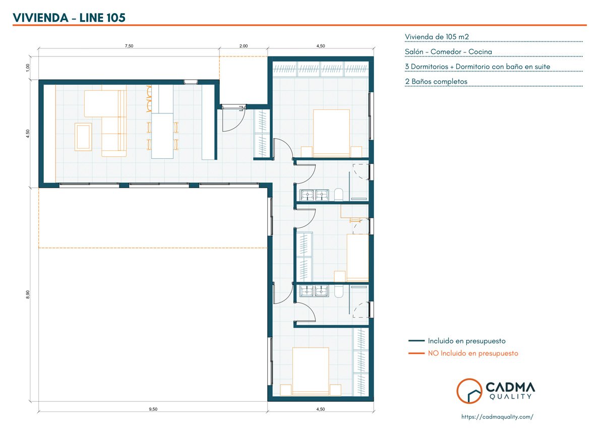 Esta vivienda de 105 m² de superficie construida se distribuye en una única planta con diseño en forma de L. El diseño se articula en torno a un hall de entrada central con armario guardarropa que divide la zona de día de la de noche, garantizando la independencia y el descanso en cada estancia.