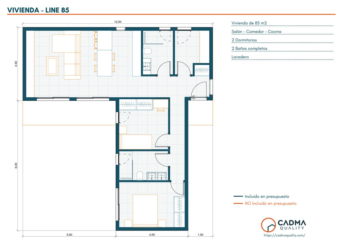 Esta vivienda de 85 m² de superficie construida se distribuye en una única planta en forma de L, optimizando la separación entre sus zonas. Está compuesta por un salón-comedor con cocina de diseño abierto, un espacio vanguardista y luminoso con acceso directo a la zona de porche, jardín y piscina privada. La cocina se entrega totalmente equipada con mobiliario, encimera y electrodomésticos seleccionados para integrarse perfectamente con el diseño interior.